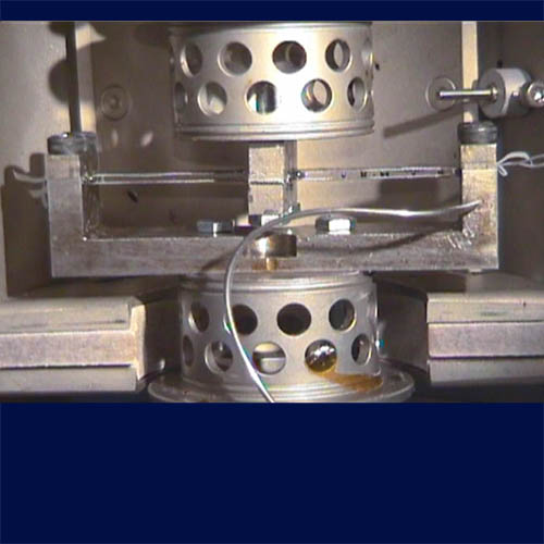 Photo of the ‘sandwich beam tool’, used to measure the evolving viscoelastic properties of epoxy resin from liquid to solid states in the Dynamic Mechanical Analyser (DMA). The resin in between two leaf springs turns these parallel springs into a sandwich beam. The DMA measures the stiffness of the beam.